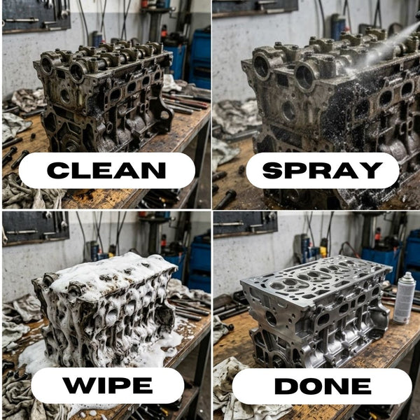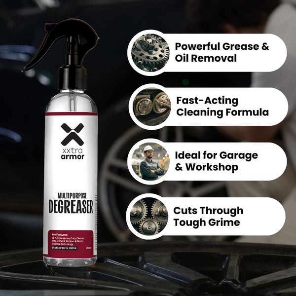 Powerful degreaser spray that removes oil, grease, and grime from engines, tools, and workshop surfaces for fast and effective cleaning.