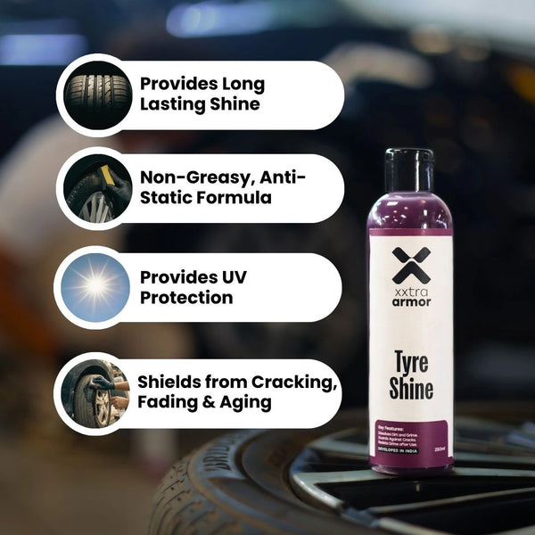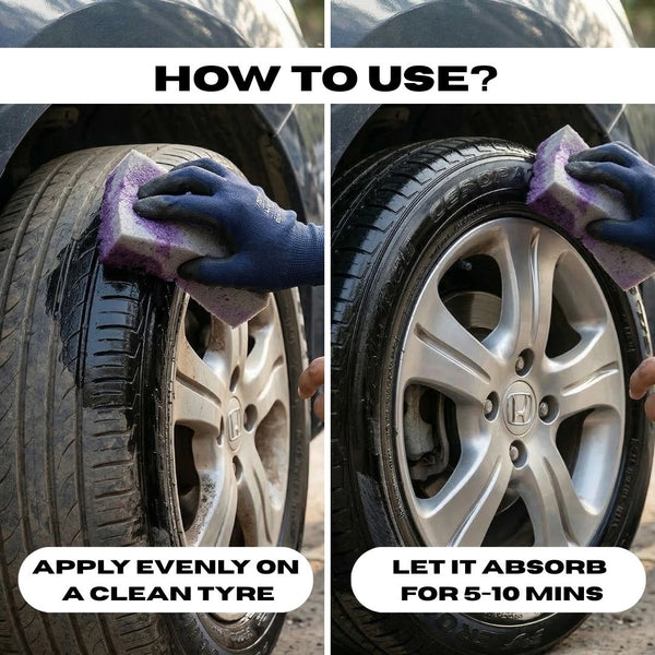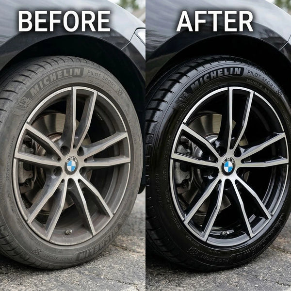 Tyre shine gel that restores faded tyres with deep black gloss while protecting against UV damage, cracking, and daily wear.